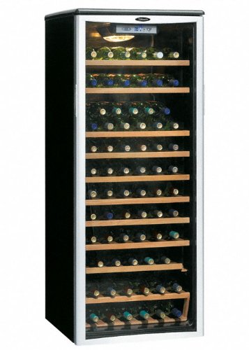 Danby Stainless Look Freestanding Wine Cooler DWC612BLP. 75 bottle (11.0 cu. ft.) capacity. Interior display light. Free standing application. 10 full width wooden shelves. 9 Removable Wooden racks. Tempered glass door with Platinum door trim. Reversible door hinge. Wood Shelving. LED Display. Humidity Reservoirs. Unit width: 23 10/16. Unit depth: 25 11/16. Unit height: 58 13/16. Carton width: 26. Carton depth: 27 9/16. Carton height: 62 4/16. Shipping weight: 181 lbs.. Electrical Requirements: 15 Amps, 115 Volts. With a sleek look and a 75 bottle capacity, this cooler keeps your wine at their ideal temperatures, making it a must for entertaining and dinner parties. See the product manual for a wine temperature guide.