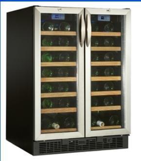 Features and Benefits:54 bottle capacityDesigned for a built-in applicationTwin door design offers two independently controlled environments to store and age your favorite red and white winesElectronic thermostat with LED display allows the temperature to be accurately set and maintainedTemperature range can be set between 4deg;C and 18deg;C (39deg;F - 64deg;F)Elegant stainless steel framed doors are set against the softly lit black interiorBeech wood trimmed shelves extend three quarters of their length allowing for easy access to the wineTempered glass door is shatter resistant and helps protect the wine from harmful UV lightIntegrated door locks protect both your wine and childrenLED displayHumidity reservoirsDimensions and Weight:Size: 23.81"W x 24.81"D x 34.43"HWeight: 145 lbs.Warranty:5 year limited warranty2 years parts and labor3 years parts only on sealed system
