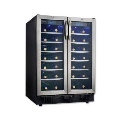 3900147 Features: -Built-in or freestanding application.-Dual temperature zones for red and white storage.-Twin door design holds up to 27 bottles per compartment.-Temperature range of 4 C 18 C (39 F 64 F) per compartment.-Precise digital thermostat with LED display allows the temperature to be accurately set and monitored through the door.-Frost free, fan forced cooling system combined with the digital thermostat provides a more consistent internal temperature than an automatic defrost system.-Cool blue LED lighting beautifully showcases the wine without the heat created by an incandescent bulb..-Stainless steel trimmed wire shelves match the stainless steel exterior.-Tinted tempered glass door helps protect wine. Specifications: -54 bottle (5 cu. ft.) capacity.